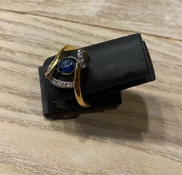 twisted ring verguld 14 karaats met blauw safier kleurige steen met zirconia's